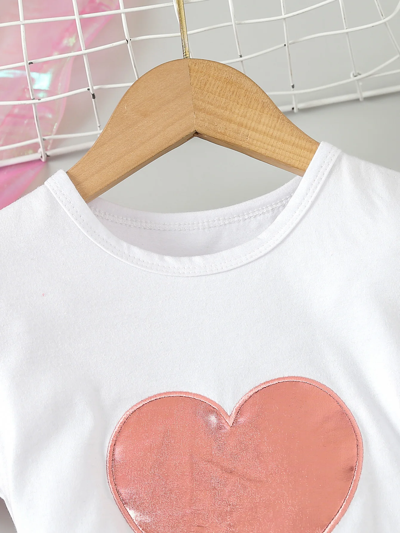 Dia dos valetinos crianças meninas roupas confortável manga curta bonito amor bordado camiseta shorts de couro falso 2 pçs conjunto roupa
